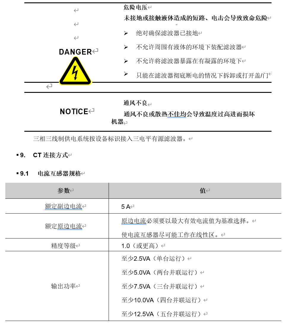 ? ? DANGER | 危險(xiǎn)電壓 如果在連接至電網(wǎng)時(shí)或從電網(wǎng)斷開(kāi)后15分鐘內(nèi)打開(kāi)有源濾波器,會(huì)因電擊或短路而導(dǎo)致致命危險(xiǎn)。 所有操作(包括打開(kāi)設(shè)備外殼、拆除或安裝連接電纜)只可交由專業(yè)人員完成。 |