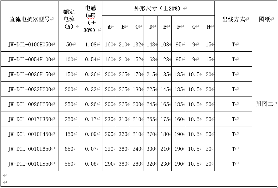 三、??? 直流電抗器技術(shù)規(guī)格及選型表