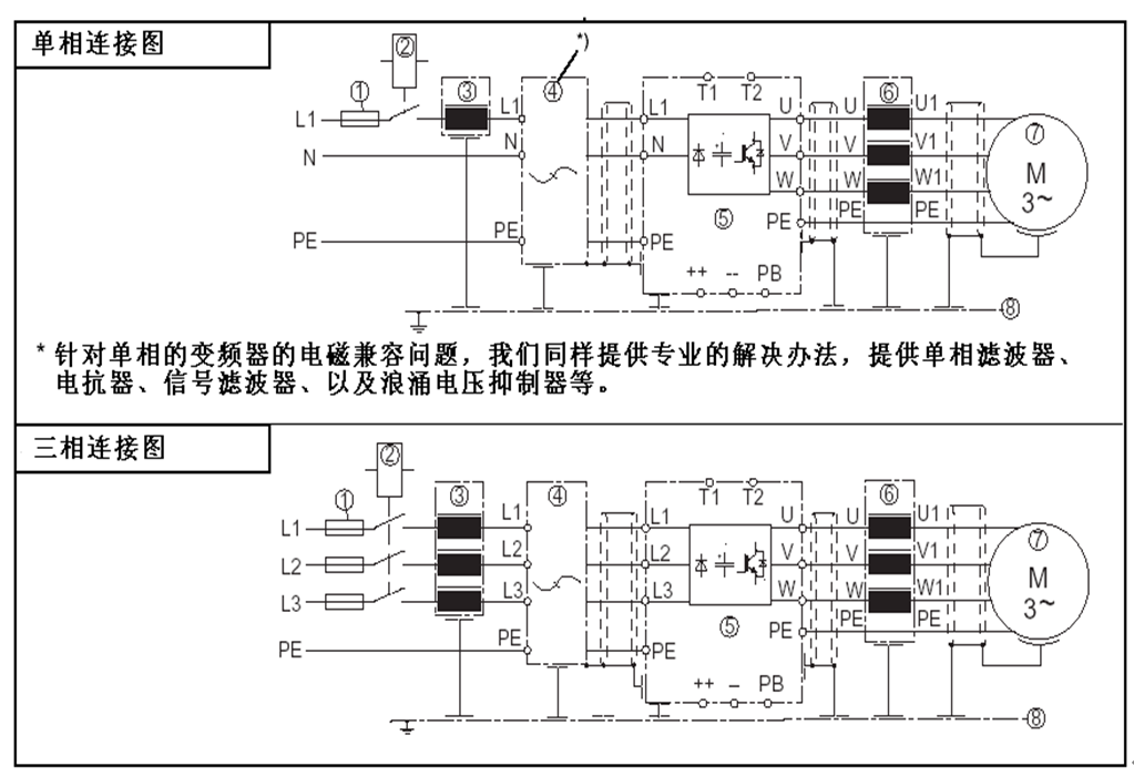 ⑥輸出電抗器或輸出濾波器或正弦波濾波器?? ⑦馬達(dá)?? ⑧地線匯流排